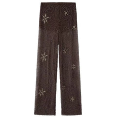 Part of our Spring/Summer 2025 collection, these pants are designed for the woman who loves to make a statement. The rich brown hue serves as the perfect canvas for intricate beading and shimmering sequins, catching the light beautifully with every movement. Featuring a modern translucent finish, they offer a lightweight, airy feel while maintaining a sophisticated and high-fashion aesthetic.