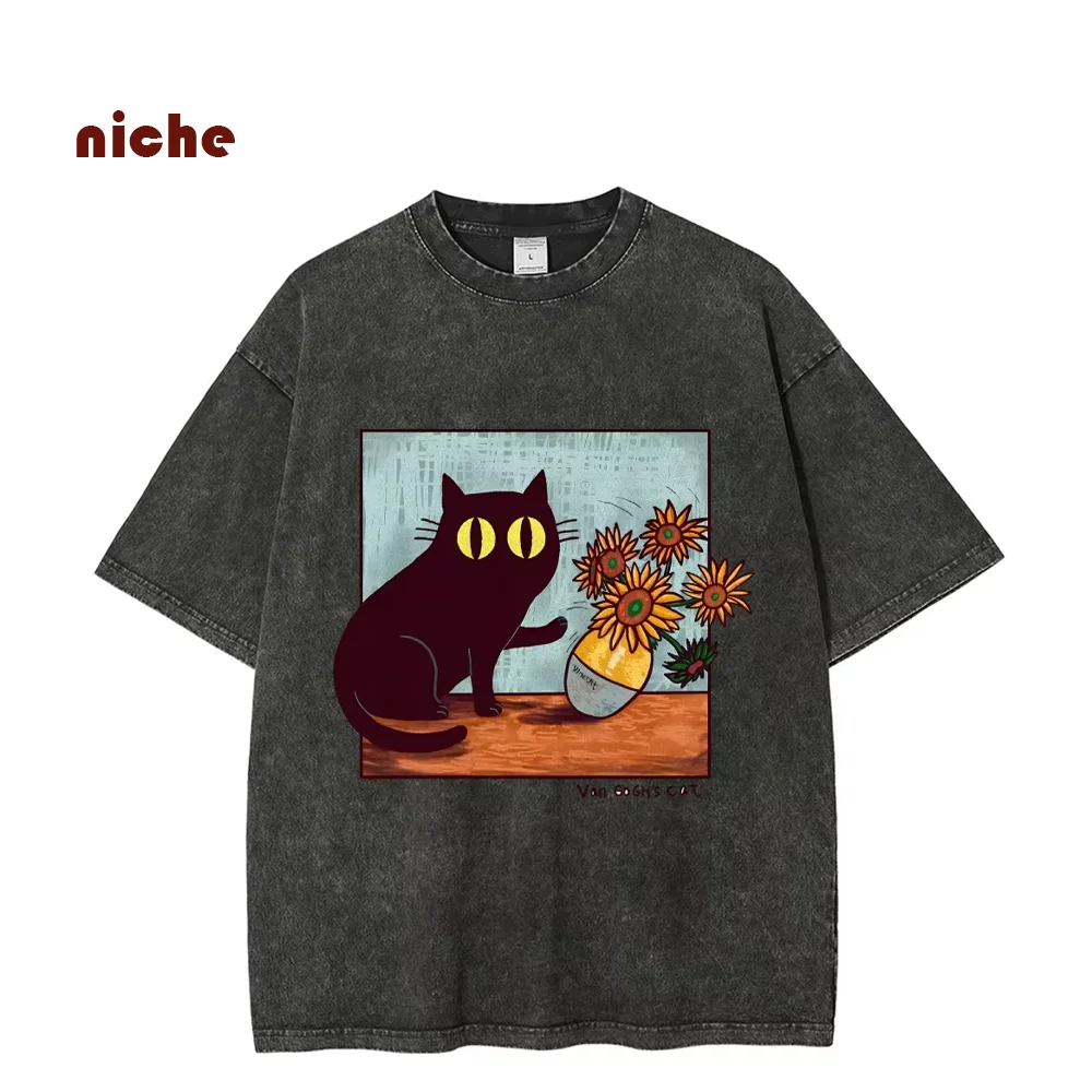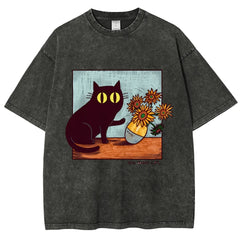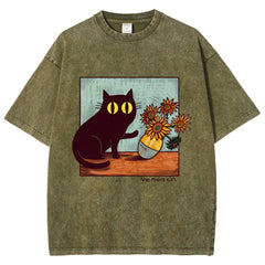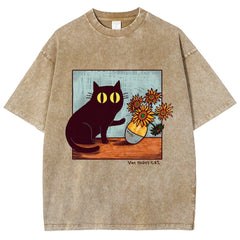 Cartoon Kitten Chrysanthemum Vase Print T-Shirt Round Neck Washed Shoulder Designer 2025 New Trendy Fashion Short Sleeves