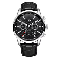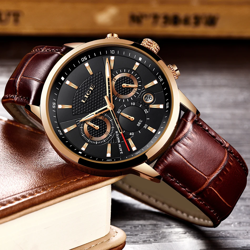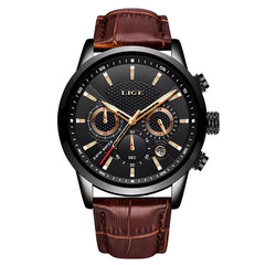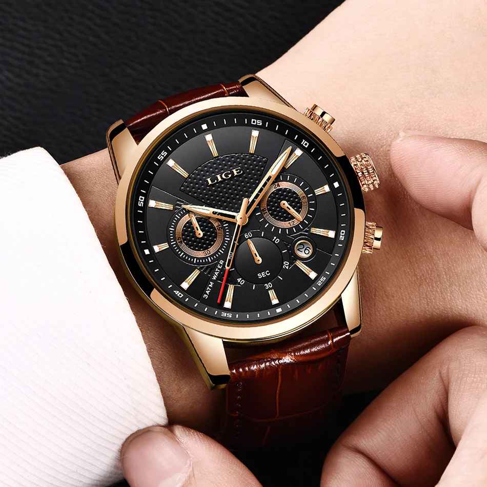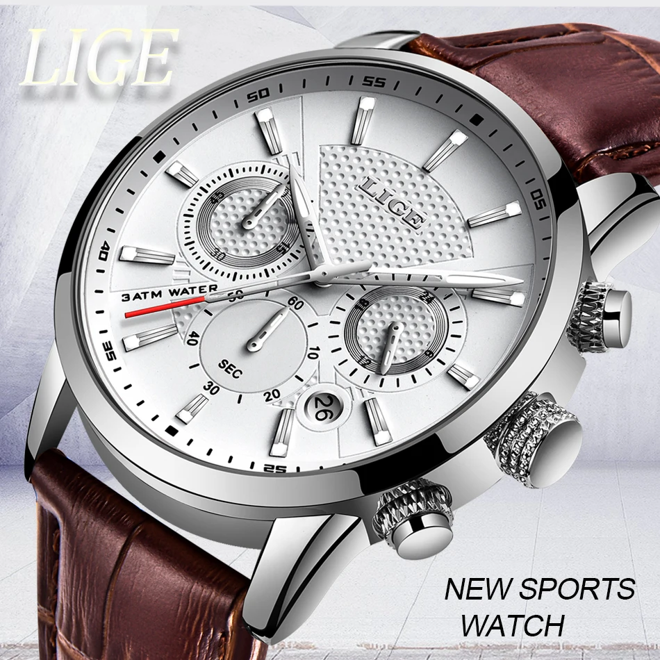 LIGE Mens Watches Luxury Waterproof Military Sport Man Watch Chronograph Genuine Leather Men Quartz Wristwatch Relogio Masculino