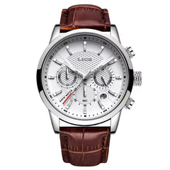 Q: Can I read my watch in total darkness? A: Yes, the timekeeping has a glow function so you can read the time clearly at night (the luminescent coating provides long-term lighting in the dark only after a short exposure to light). Q: What is the maximum wrist size of this watch? A: The watch is 22 cm long and very large. Good watch, beautiful and lightweight, good value for money. Hope all this helps you Q: How to adjust the time calendar of the watch? A: You should pull out the circular button on the side of the first part of the watch to adjust the date, and then rotate it clockwise. When you pull out the second part to rotate clockwise, adjust the time Q: How long is the protection of the watch? A: Hello, the protection time of the watch is 2 years, and it is equipped with a warranty card. Q: Is the mirror of the watch clear? A: The glass is a mineral high-strength glass (scratch-resistant, drop-resistant, and dirt-resistant), which can clearly see the time Q: What is the quality of the watch strap? A: High-quality Leather is extremely durable and flexible, Do not fade,making it an ideal material for wristbands"" Q: Is it in a box? A: Yes, friends, watches are sent with the box Kindly Notice Multifunctional watch. All the pointers are working. This watch has a chronograph function. The watch waterproof 3bar can use to wash hand without hot/warm water, can't take shower, bath, swim etc AFTER-SALE SERVICE: Well packaged in nice gift watch box. 90-day free return/exchange,any question or problem,please feel free to contact seller