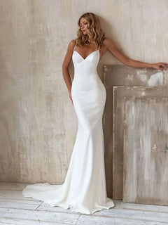 Sexy White Mermaid Wedding Dress For Woman V Neck Backless Simple Bridal Custom Gown Sweep Train Robe De Mariage New Arrival