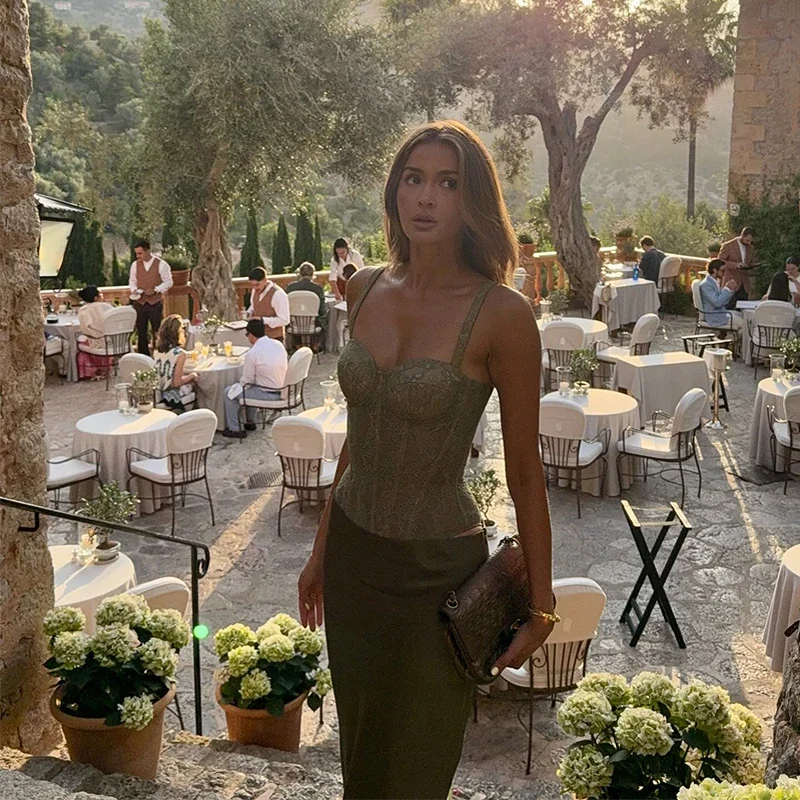 Elegant Women Summer Party Dresses Sets 2 Pieces Lace High Waist Lace Up Spaghetti Strap Top Satin Zipper Party Skirt Outfits